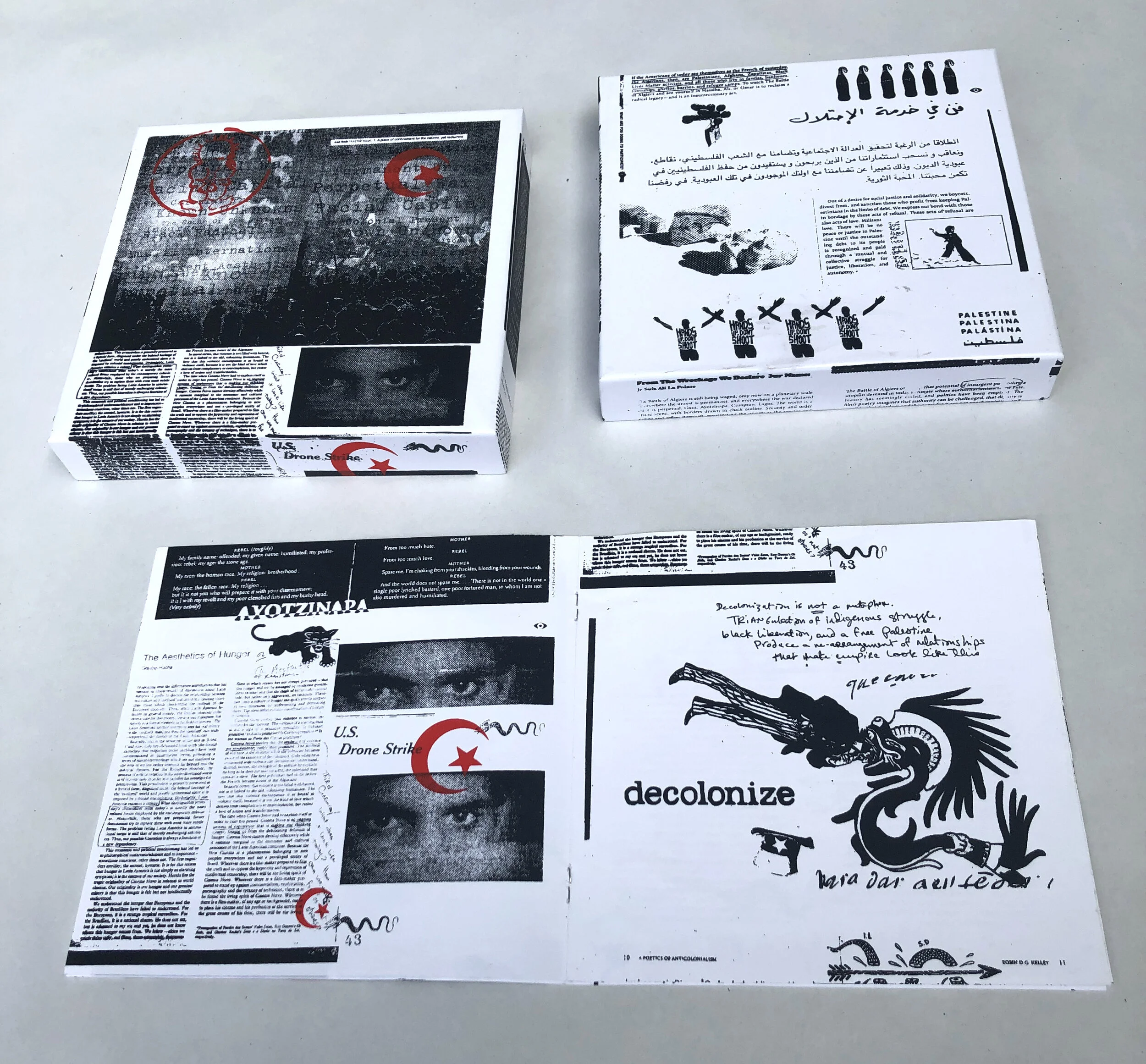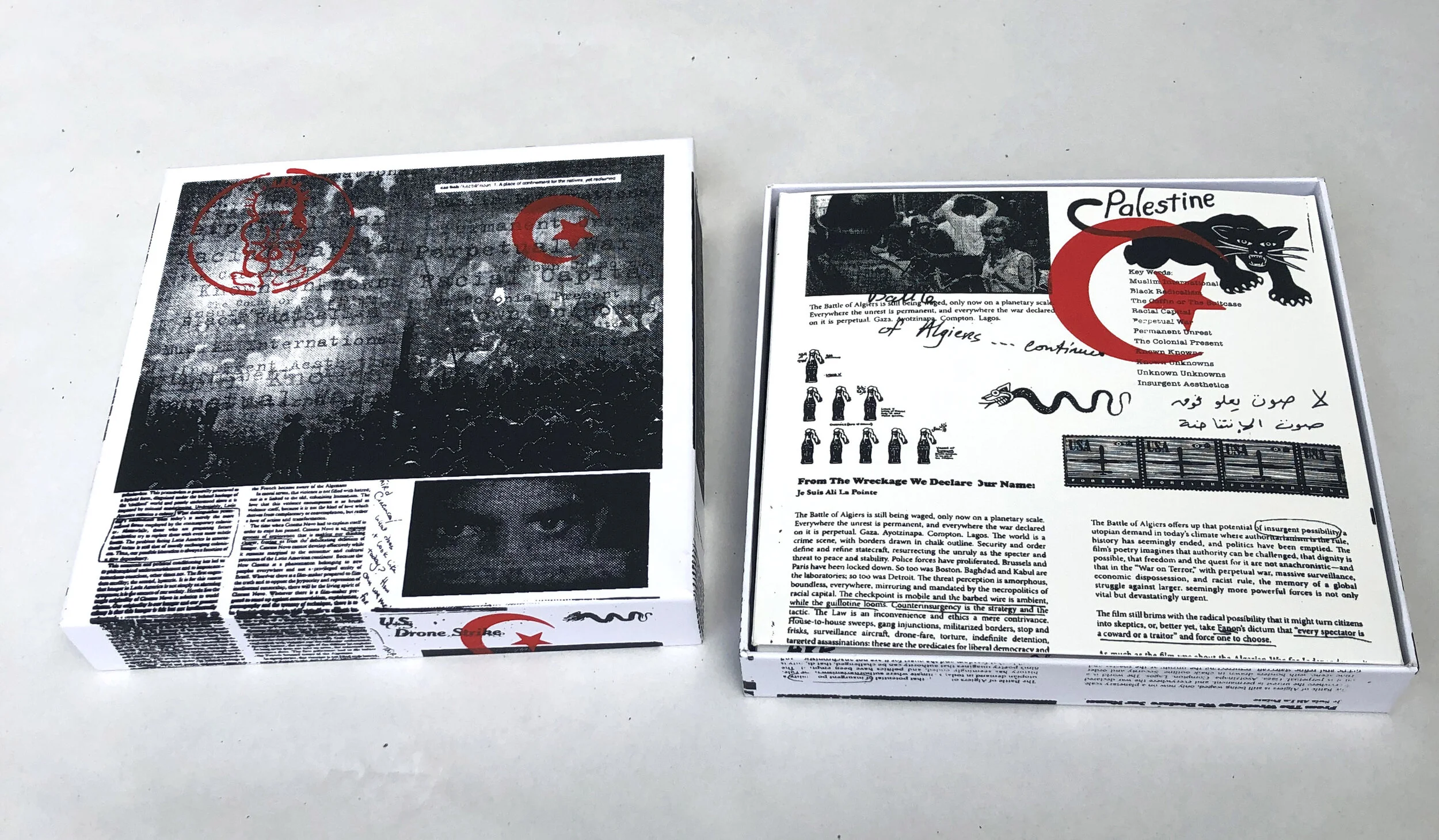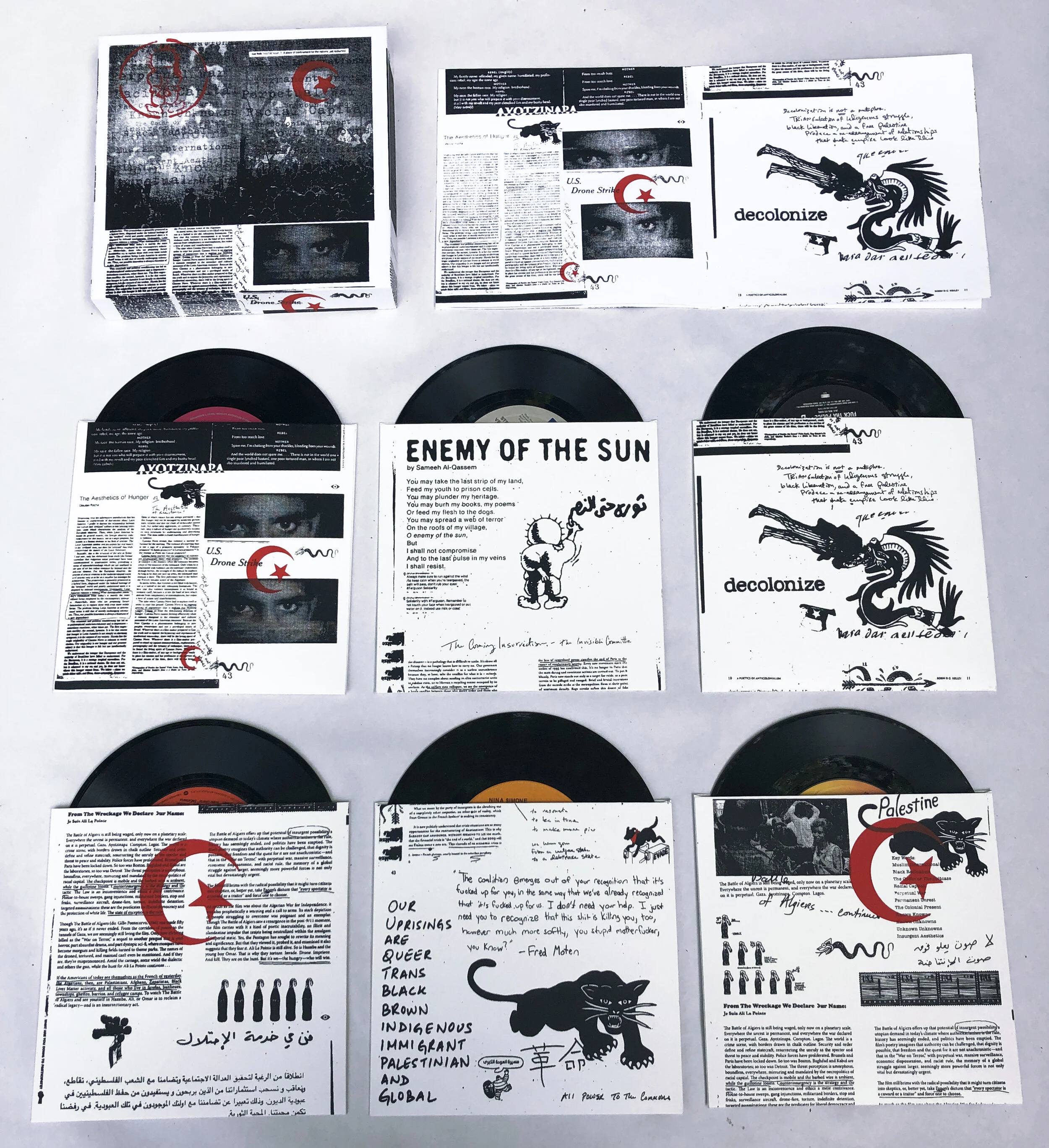 Screen printed. Includes 6 seven inch record jackets and a 12 page zine in a two piece lift box, (Unique).
