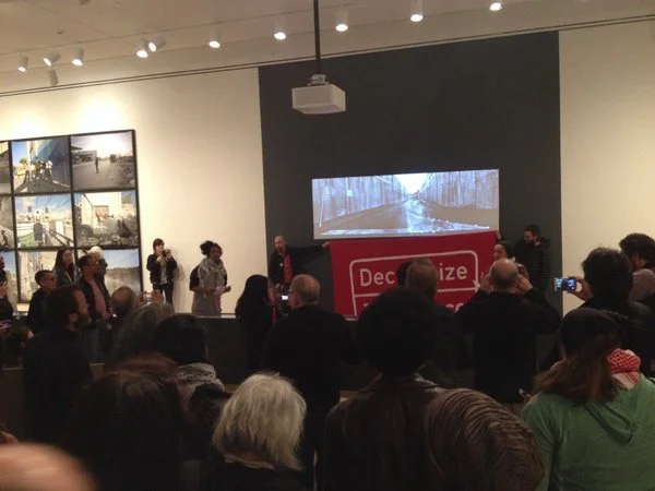 We are here, in this place, with our friends, families, and communities. This place, the place of the museum, claims to be dedicated to cultural enrichment, public education, and the housing of great works of art, all in the name of the People. Yet this place also exists within an expanded field of capitalism, imperialism, and white supremacy. This place, the Brooklyn Museum, lends itself to these oppressive powers. This place allows itself to become complicit with processes of racist displacement from Crown Heights to the West Bank of occupied Palestine. This place happily facilitates gentrification, sporting a 1% real estate developer on its board even while claiming to serve the very communities being driven from their homes. This place proudly hosts an exhibition that aestheticizes apartheid and settler-colonialism--even while patting itself on the back for displaying works of art produced by the liberation movements of the past century. As artists, as workers, as citizens and noncitizens, we are here in the living spirit of decolonial struggles. We are conjuring the powers of our ancestors to begin decolonizing this place, liberating this place, and returning this place to the People.