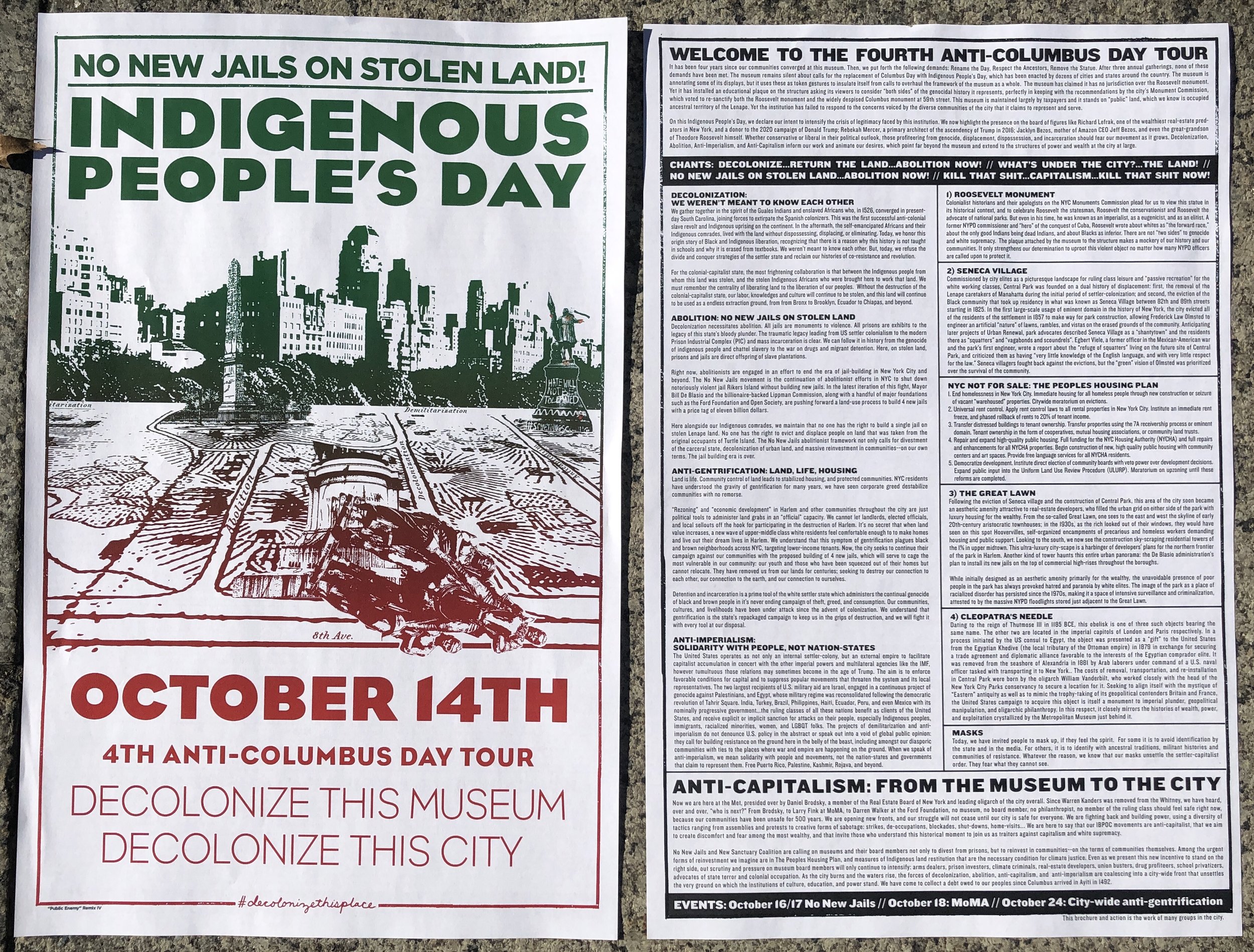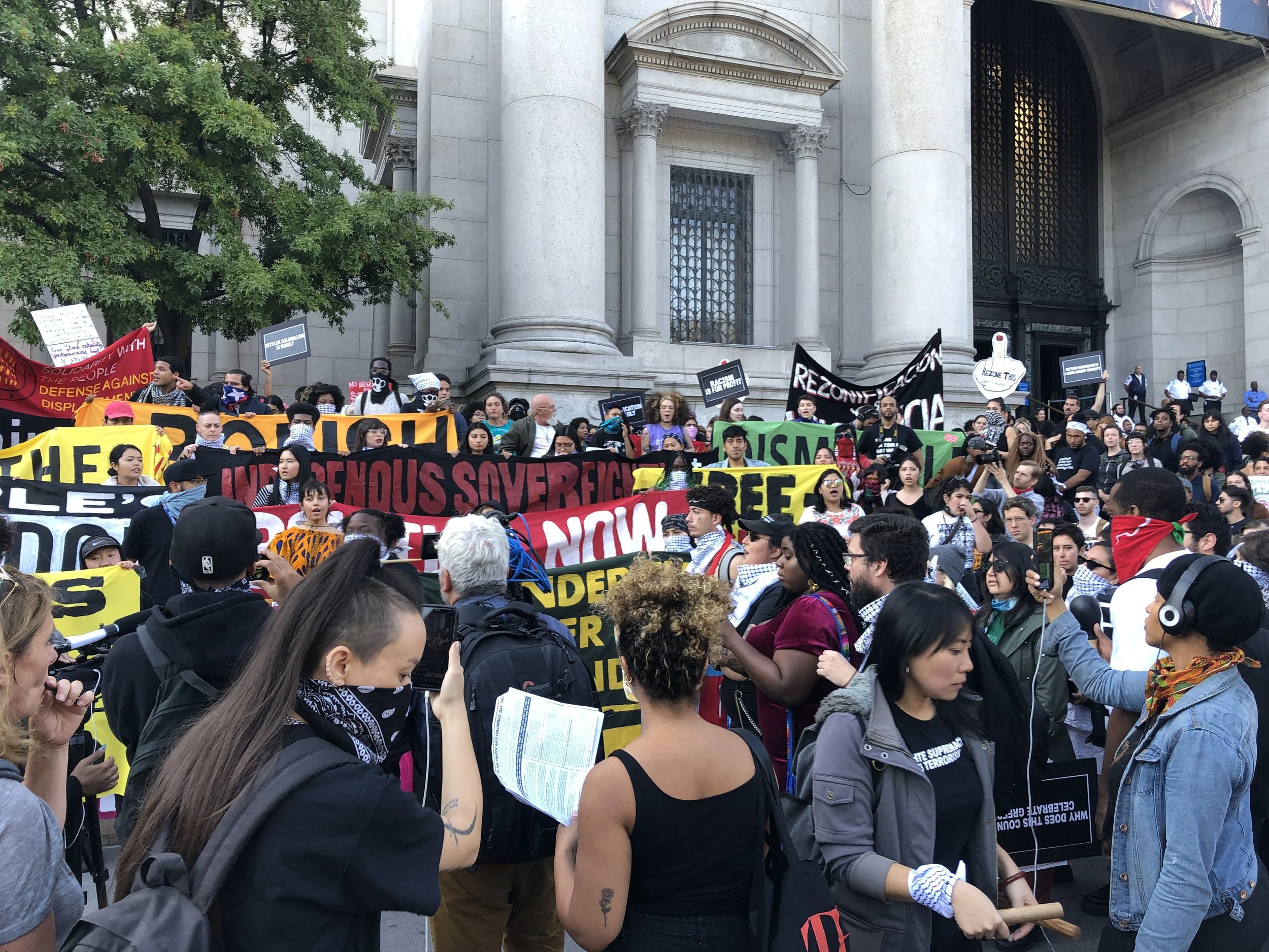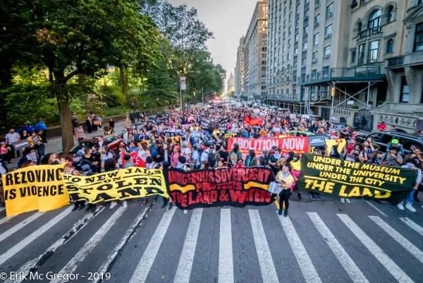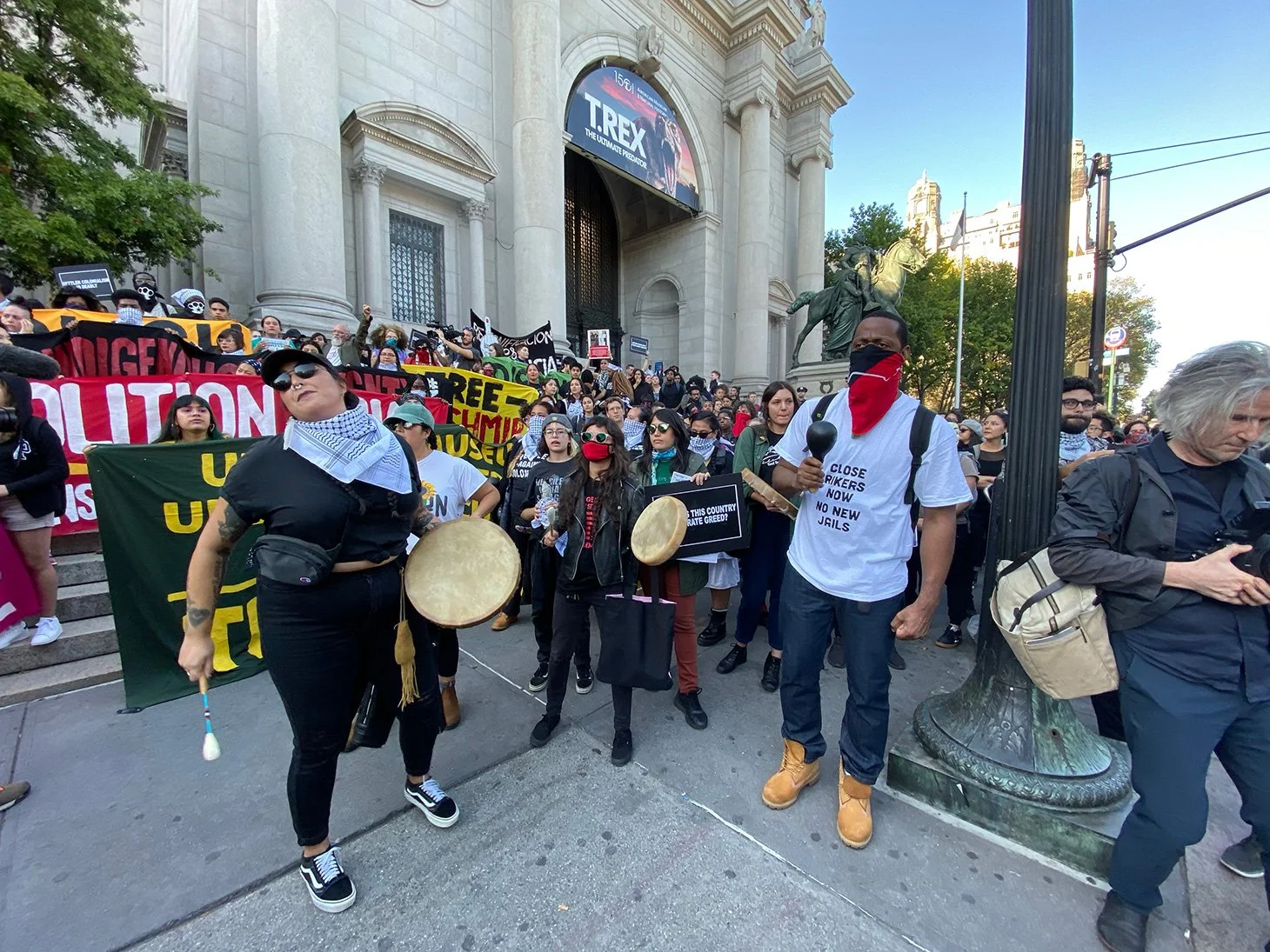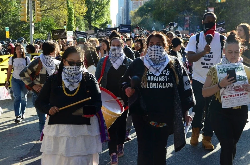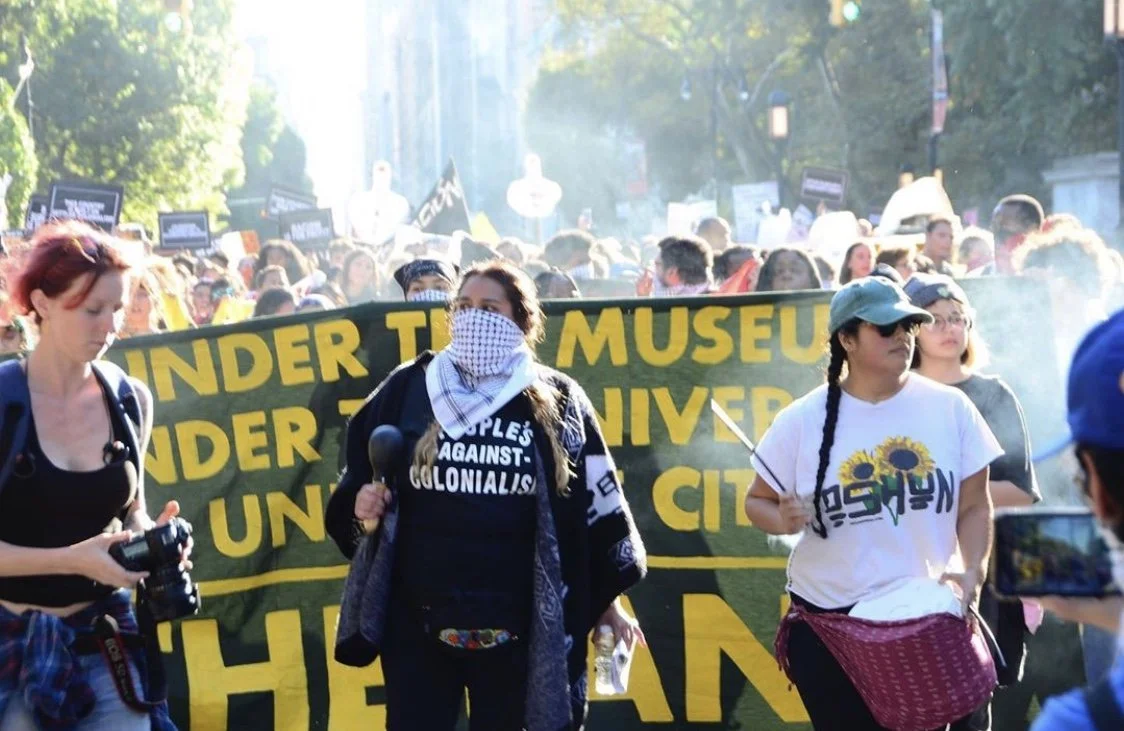 It has been four years since our communities converged at this museum. Then, we put forth the following demands: Rename the Day, Respect the Ancestors, Remove the Statue. After three annual gatherings, none of these demands have been met. The museum remains silent about calls for the replacement of Columbus Day with Indigenous People’s Day, which has been enacted by dozens of cities and states around the country. The museum is annotating some of its displays, but it uses these as token gestures to insulate itself from calls to overhaul the framework of the museum as a whole. The museum has claimed it has no jurisdiction over the Roosevelt monument. Yet it has installed an educational plaque on the structure asking its viewers to consider “both sides” of the genocidal history it represents, perfectly in keeping with the recommendations by the city’s Monument Commission, which voted to re-sanctify both the Roosevelt monument and the widely despised Columbus monument at 59th street. This museum is maintained largely by taxpayers and it stands on “public” land, which we know is occupied ancestral territory of the Lenape. Yet the institution has failed to respond to the concerns voiced by the diverse communities of the city that it claims to represent and serve. On this Indigenous People’s Day, we declare our intent to intensify the crisis of legitimacy faced by this institution. We now highlight the presence on the board of figures like Richard Lefrak, one of the wealthiest real-estate predators in New York, and a donor to the 2020 campaign of Donald Trump; Rebekah Mercer, a primary architect of the ascendency of Trump in 2016; Jacklyn Bezos, mother of Amazon CEO Jeff Bezos, and even the great-grandson of Theodore Roosevelt himself. Whether conservative or liberal in their political outlook, those profiteering from genocide, displacement, dispossession, and incarceration should fear our movement as it grows. Decolonization, Abolition, Anti-Imperialism, and Anti-Capitalism inform our work and animate our desires, which point far beyond the museum and extend to the structures of power and wealth at the city at large.