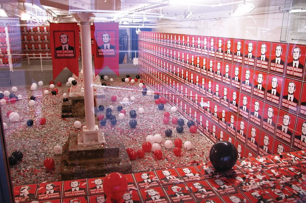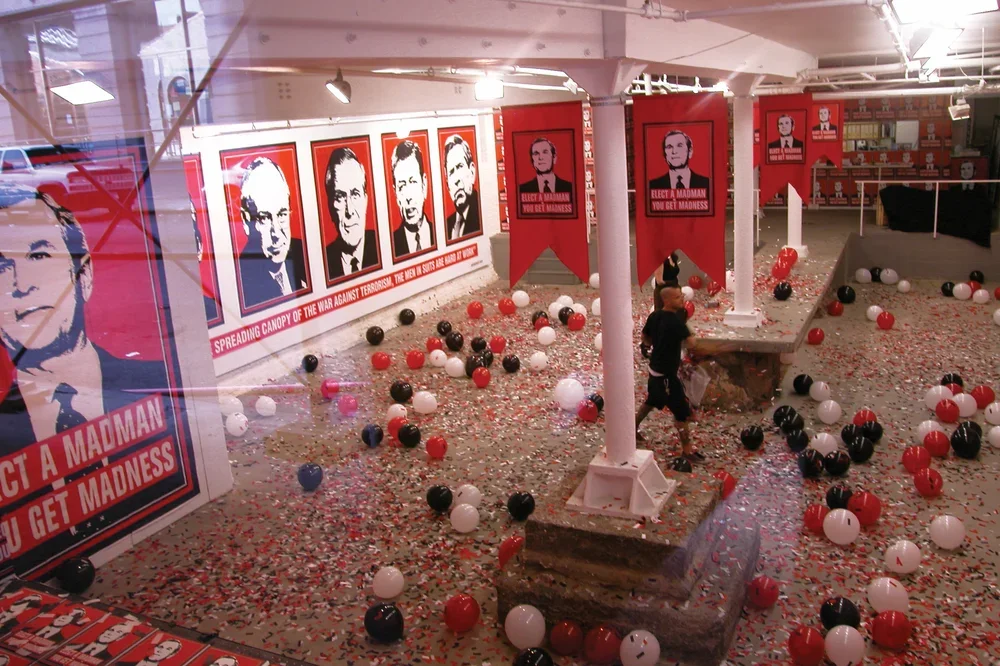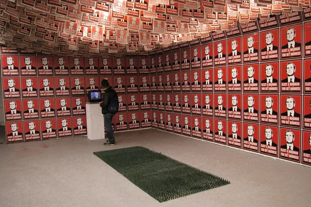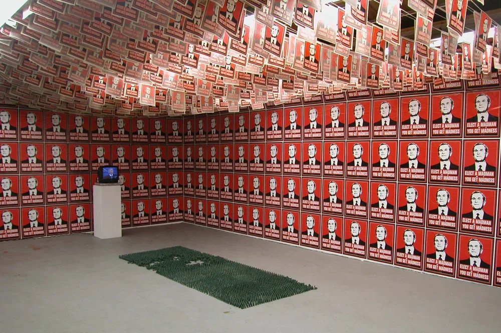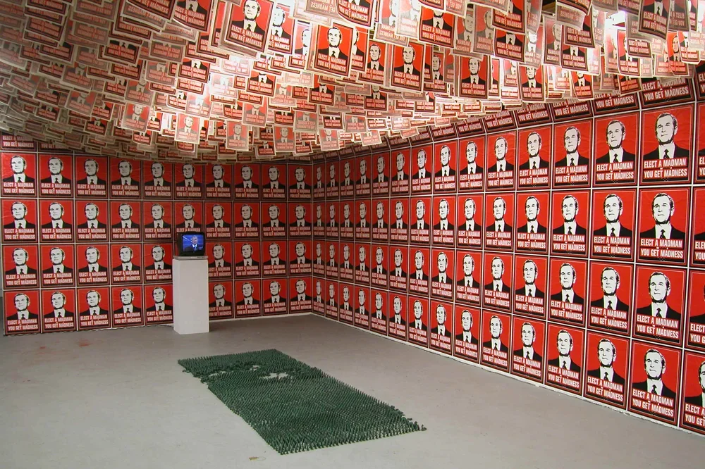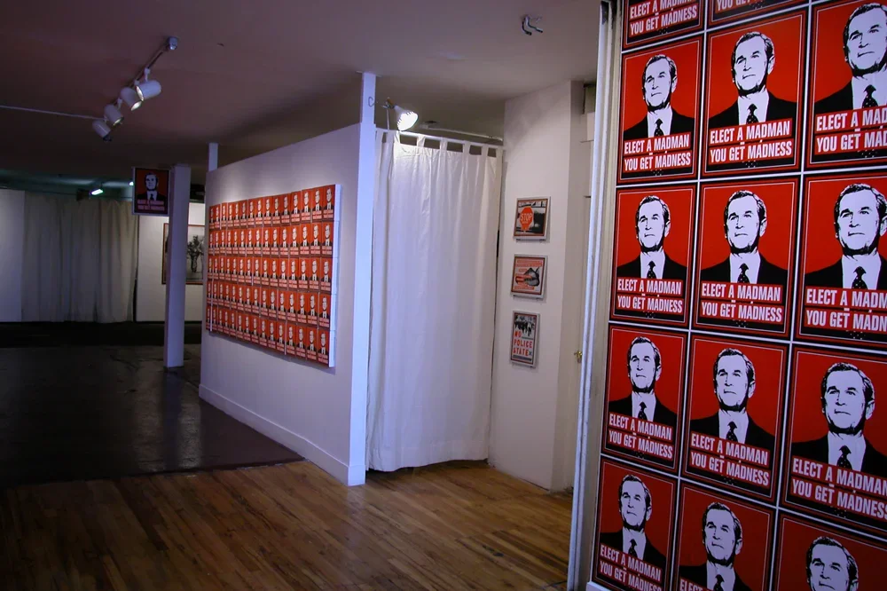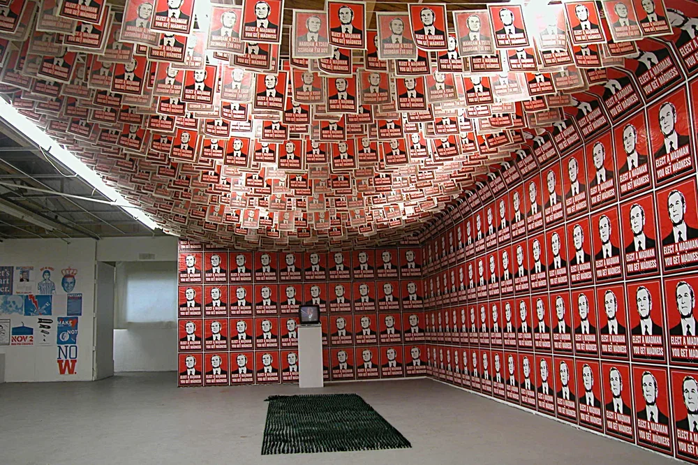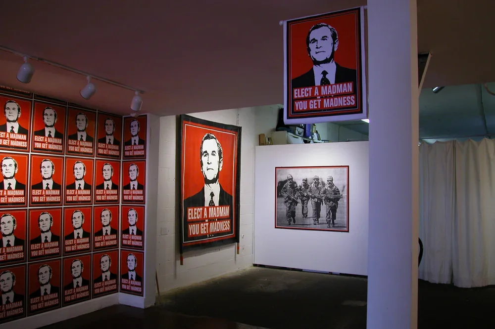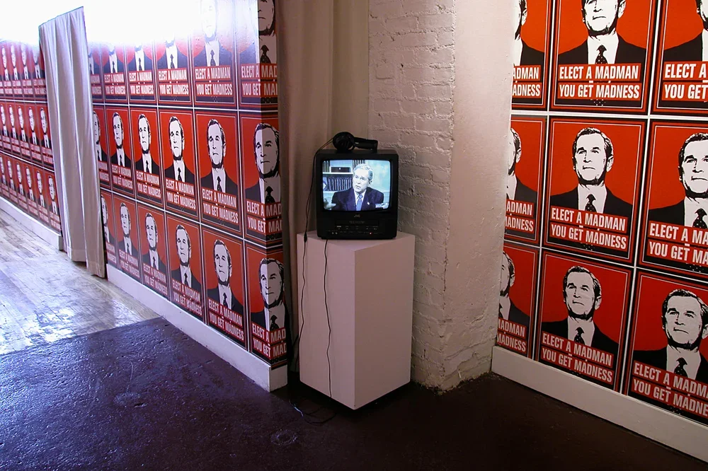 In January 2001 as an act of political protest, Kyle Goen created an iconic image of President Bush with the slogan "Elect A Madman You Get Madness" inscribed underneath. The image combines a readable, flat graphic image of President Bush with text to form a parallel to historical propaganda posters as well as to other artists like Barbara Kruger, forming a readable connection between the Bush administration and fascist governmental control. This simple gesture became an artwork of multiple manifestations that spanned and evolved throughout the eight years of Bush's presidency. Becoming not only a singular artwork but rather, one of continuous variation that became increasingly charged as the political climate transformed into one of disapproval. In what began as a free protest sticker, the image soon progressed into a poster, button, patch, a t-shirt, and finally, into installations. While the work was translated into other mediums, it remained consistently within the ethos of spreading free political paraphernalia that the viewer can take away and use, as he will. It was available for free download from an Arts in Action site, and appeared on multiple blogs and websites, often as a slogan without the accompanying image. The fact that the slogan and the image became separable is of note, for the work is not only a visual protest but also one that saturates the public consciousness.