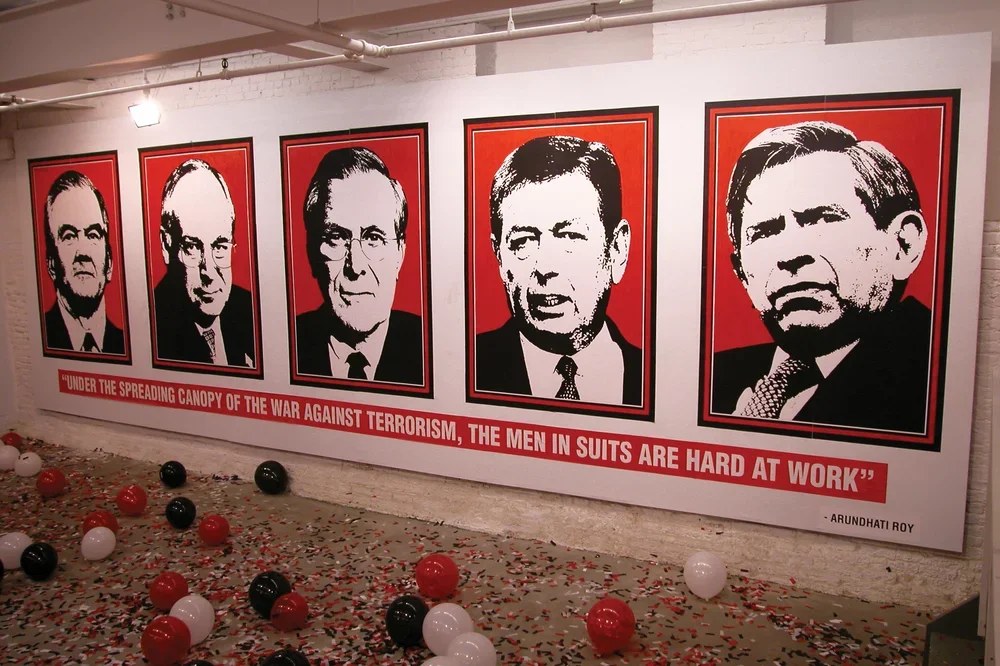 The fluid existence of the work throughout multiple mediums parallels a fluidity that allows it to exist equally within the context of street protest, the Internet, and the gallery. The poster was exhibited alongside other political protest posters, it has been handed out for free at protest rallies, and it has also appeared paneling entire walls as part of an installation piece at Stay Gold Gallery and subsequently at White Box. These visual connections to different contextual situations forms a symbiotic link between the image as it appeared in the streets and as it appeared in galleries. The work uses different strategies of political protest in different contexts. As the work is encountered in the streets or on the Internet, it acts as a reminder of politics within the everyday. When the work is exhibited in galleries, Goen uses repetition as a means to surround the viewer entirely within a politically charged installation space. His installations at White Box coincided with 2004 Republican National Convention in New York City. Using the celebratory media of the convention such as balloons, banners, posters, and confetti, in combination with the work to create a context of political mockery and strife. When viewing the image within its multiple contexts and various mediums, the work accumulates multiple layers of visual capital while simultaneously remaining a singular image used in different ways. In this way, the image becomes more than a slogan, and indeed, contributed to the language used by the media that connected Bush with madness and madmen.