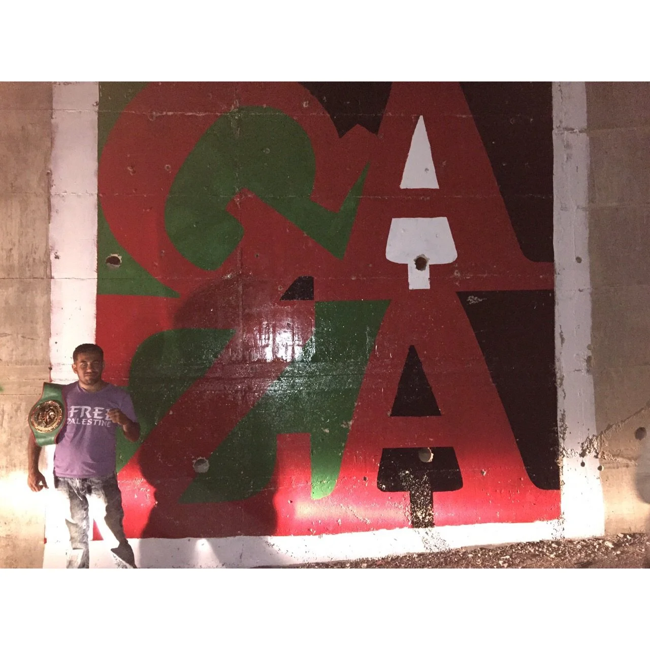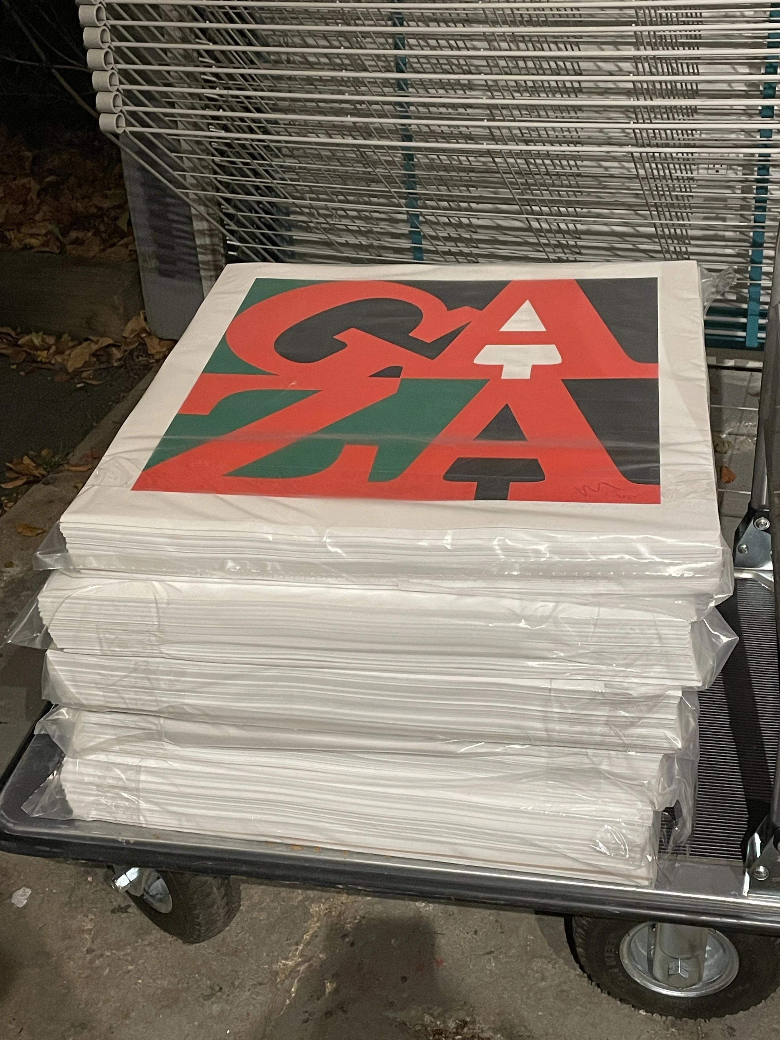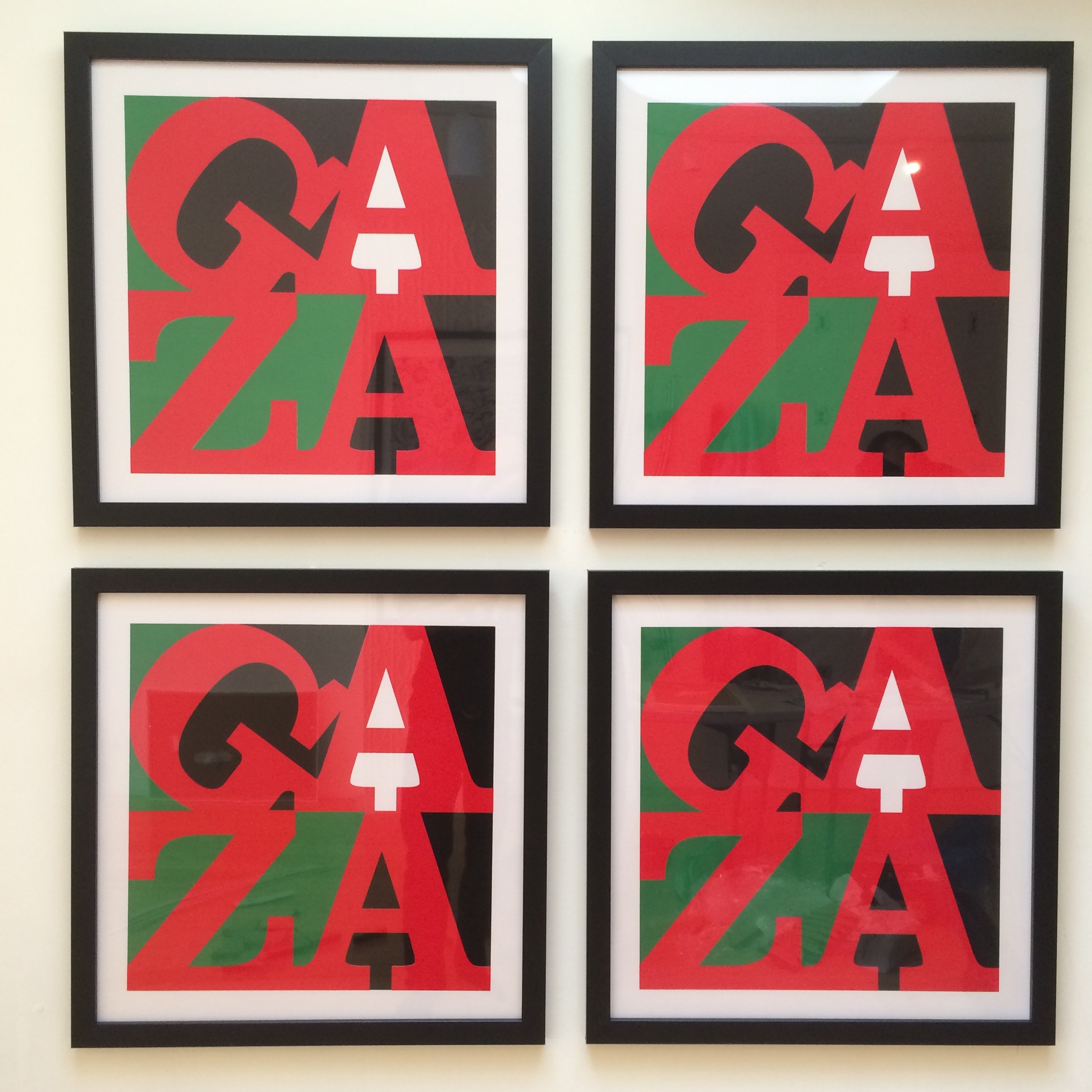 Goen’s transformation of the word “LOVE” into “GAZA” is provocative yet disarming, associating love with a geographical location that Americans have neglected, ignored, misunderstood, and defamed. The familiar, joyful lettering, recast in a bold palette (the Palestinian colors of red, black, white, and green), compels a reconsideration of “Gaza.” For those already in solidarity with Palestine, it affirms the affection. The genius of this poster is that the image can be interpreted from yards away. This made it extremely popular with demonstrators in the summer of 2014.