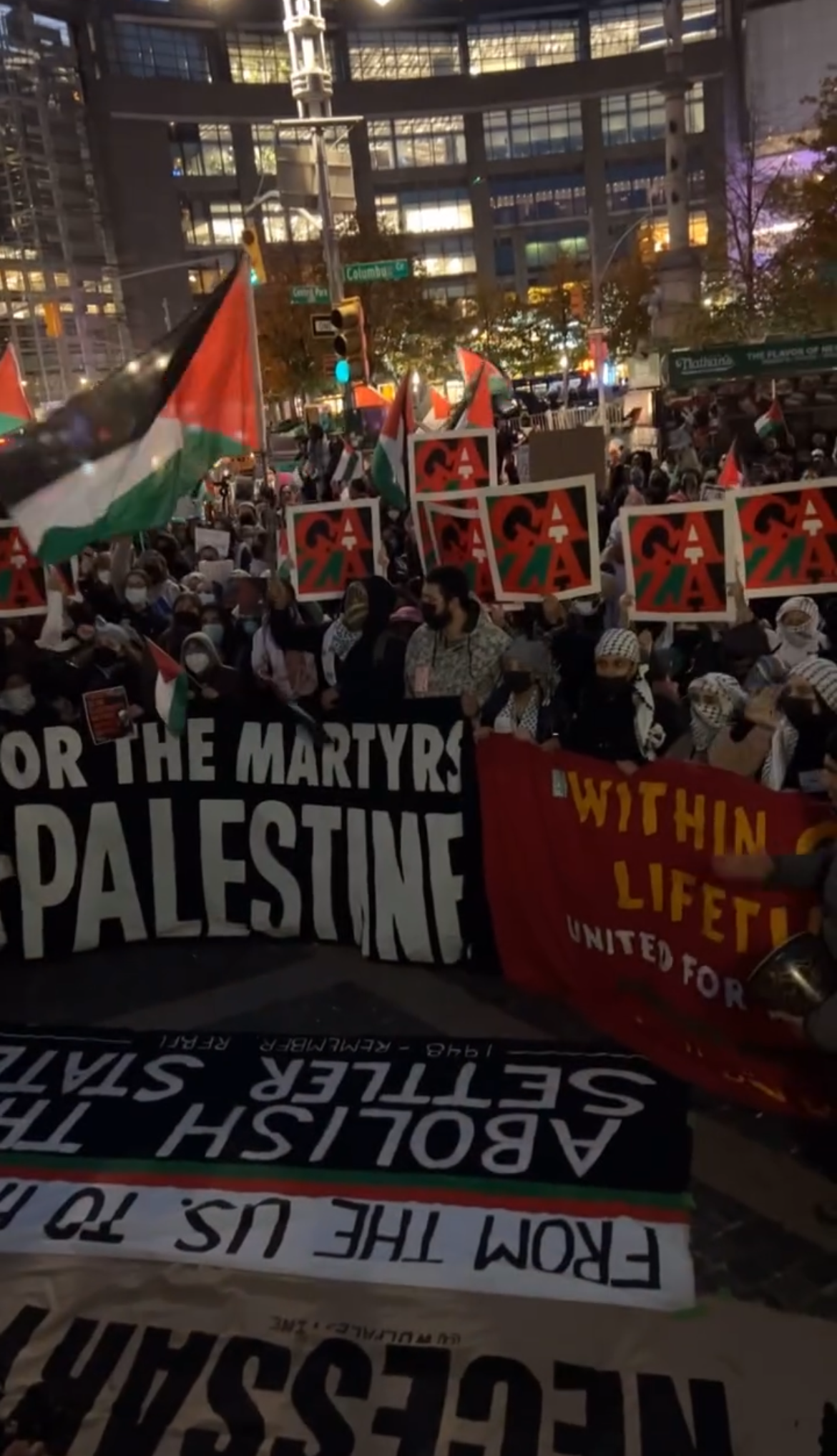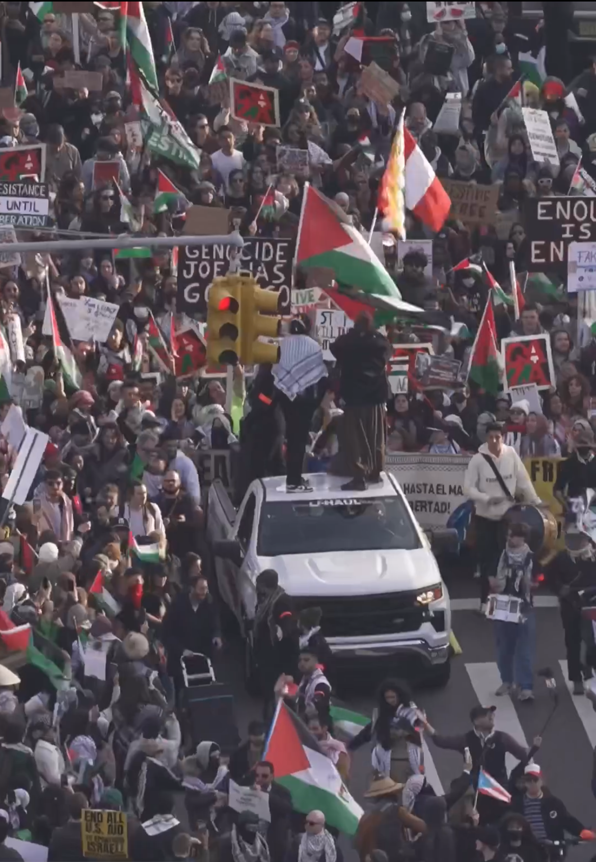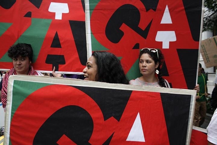 Goen’s transformation of the word “LOVE” into “GAZA” is provocative yet disarming, associating love with a geographical location that Americans have neglected, ignored, misunderstood, and defamed. The familiar, joyful lettering, recast in a bold palette (the Palestinian colors of red, black, white, and green), compels a reconsideration of “Gaza.” For those already in solidarity with Palestine, it affirms the affection. The genius of this poster is that the image can be interpreted from yards away. This made it extremely popular with demonstrators in the summer of 2014.
