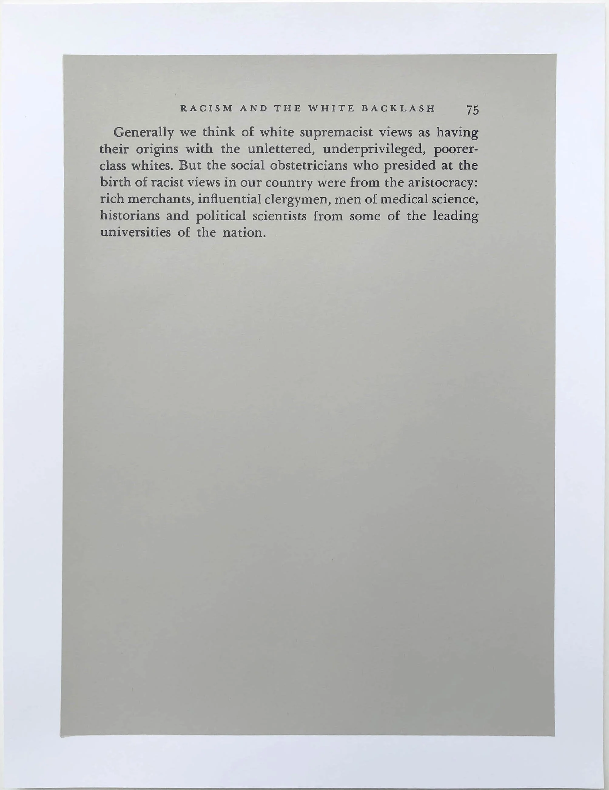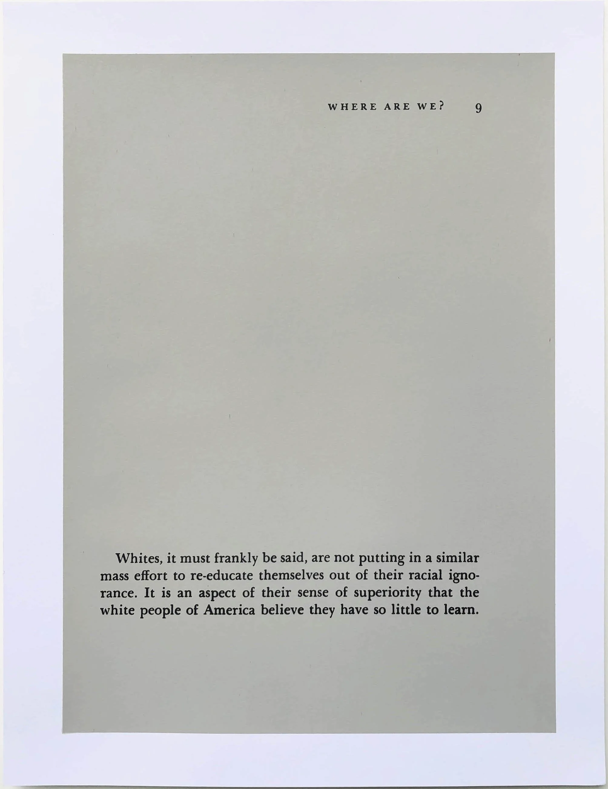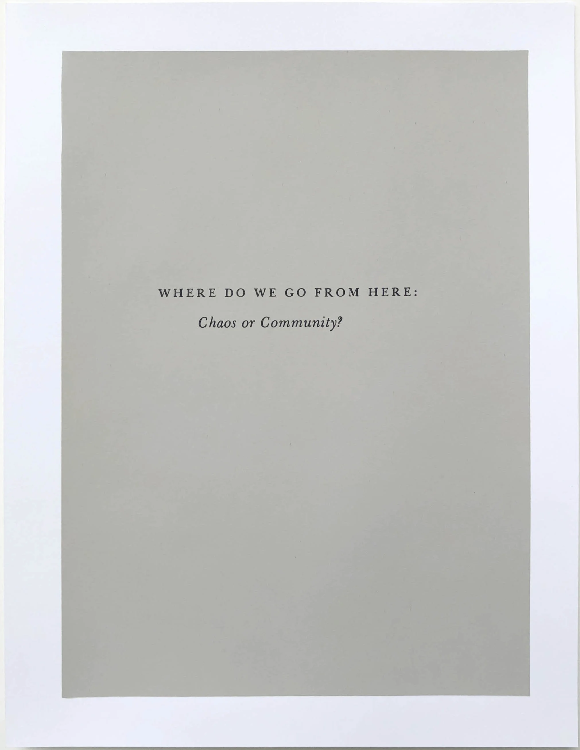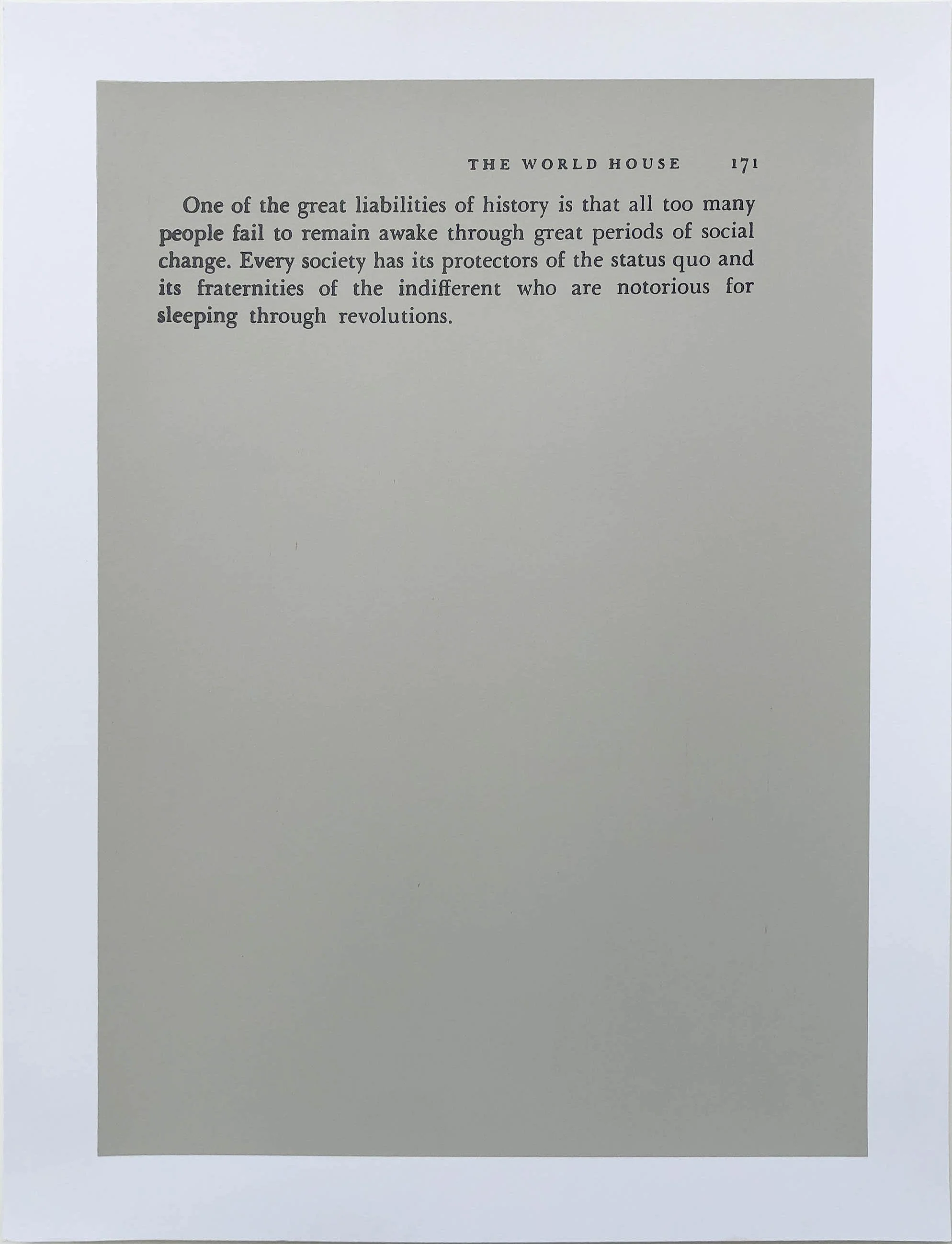 Screen printed excerpts from Martin Luther King Jr’s book Where Do We Go From Here: Chaos or Community? first published by Beacon Press in 1967, the year I was born. It was King’s 4th and last book before his assassination. Each print in the portfolio is a page from the book, the position of the text correlates with its position and page in the original book. I’ve omitted the other text on each page to emphasize the particular passages.