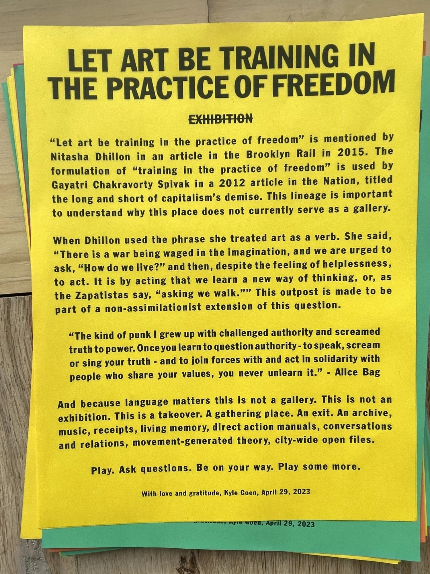 Let Art Be Training in the Practice of Freedom is a gathering place. An archive, music, receipts, living memory, direct action manuals, conversations and relations, movement-generated theory, city-wide open files.