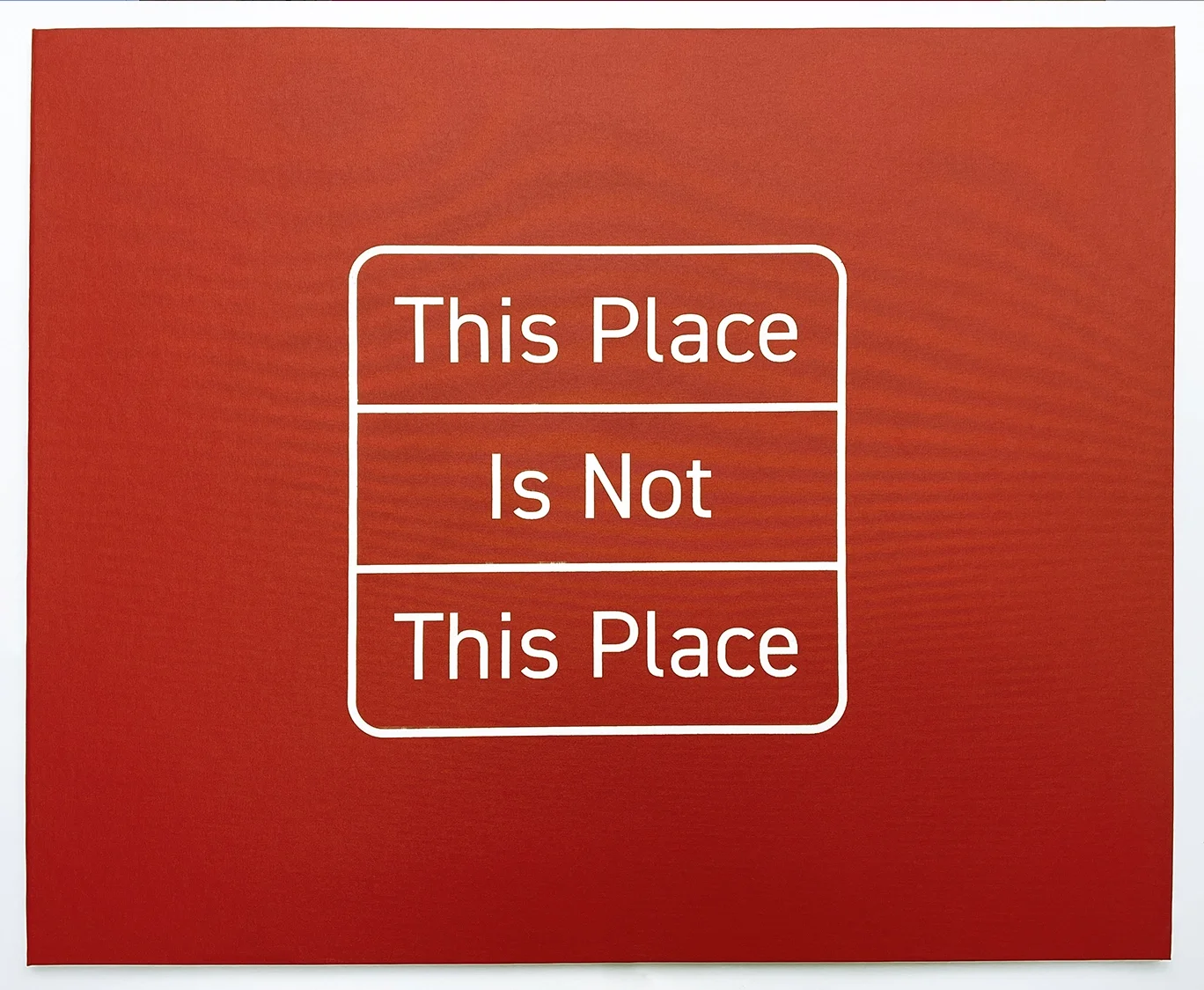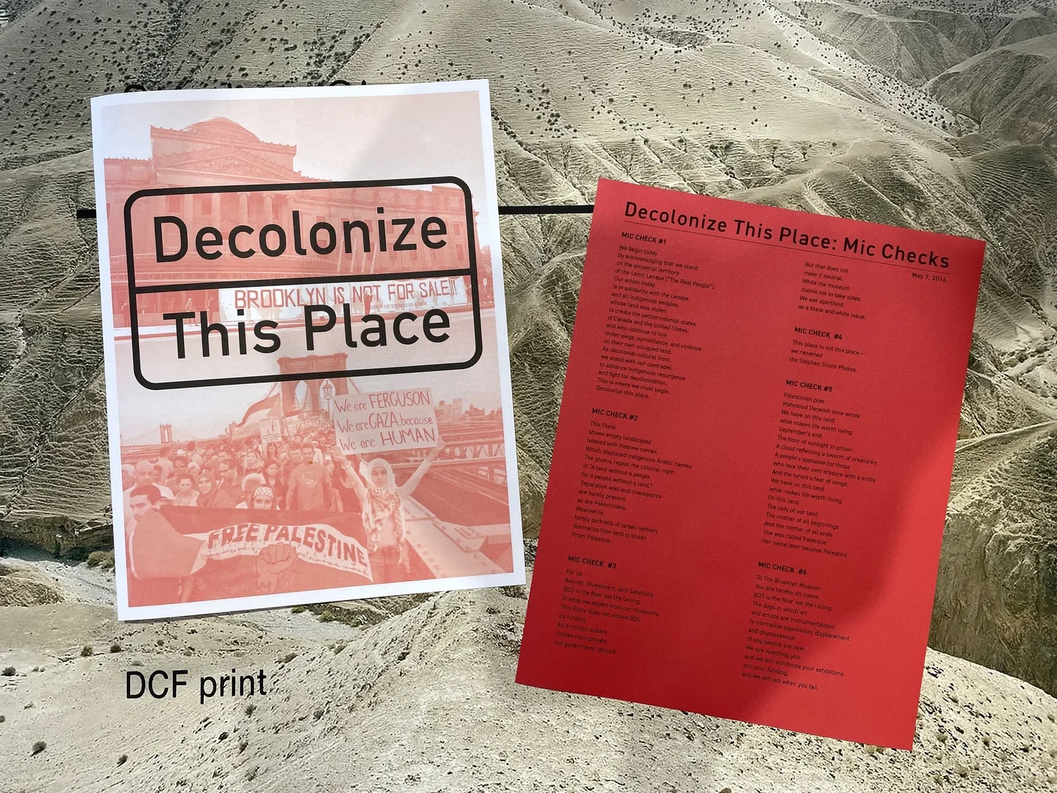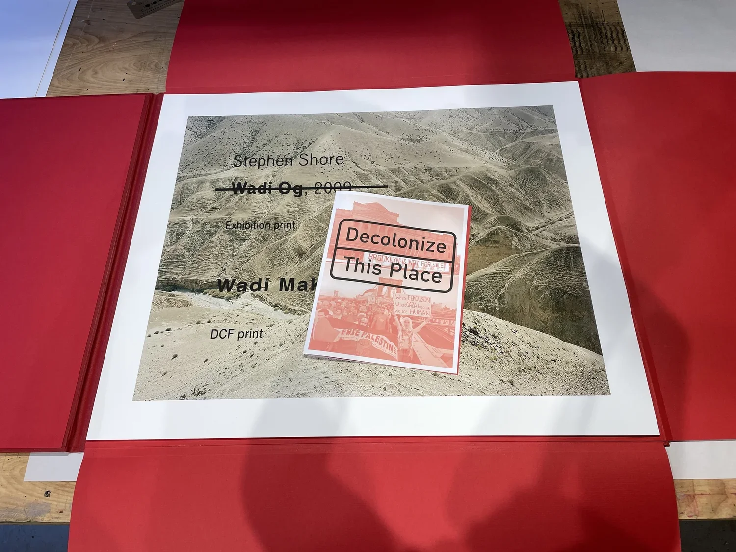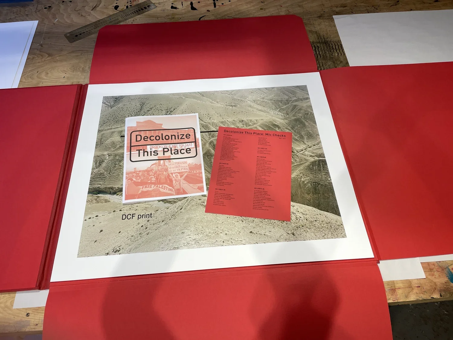 This Place Is Not This Place (Decolonial Cultural Front (DCF) Prints), 2022. One color screen print of renamed and reclaimed wall text on top of digital reproductions of Stephen Shore exhibition prints, both from the “This Place” exhibition at the Brooklyn Museum, 2016. 24” x 29.25”. Prints are housed in a handmade red cloth folder with white screen printed logo. Decolonial Cultural Front archival material included in folder. Prints are signed and numbered on the back.